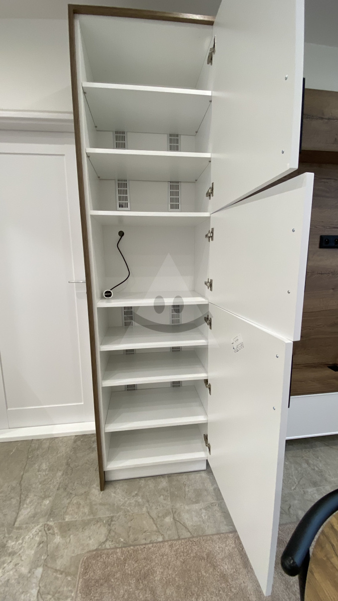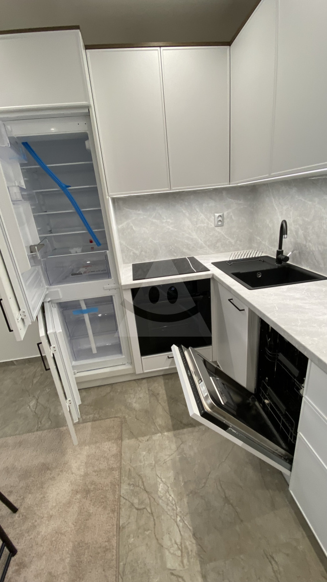 kitchen with built-in appliances, dishwasher, washing machine, living room wall, ventilated cupboard for groceries, table, chairs, sofa